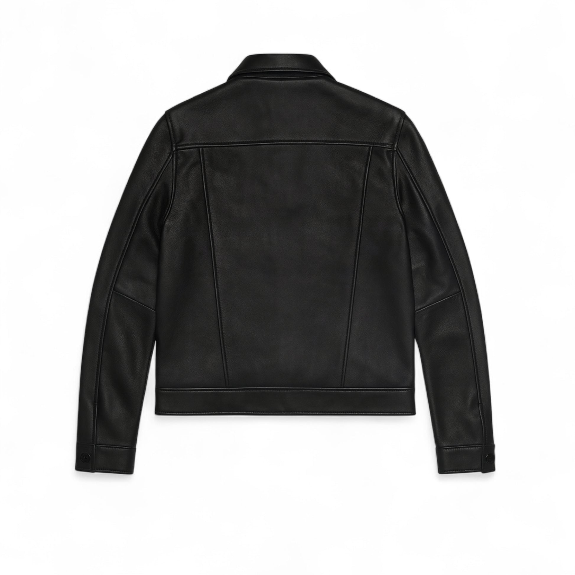 A sleek black leather jacket featuring a classic denim design, complete with button closures and chest pockets, perfect for adding a touch of edgy sophistication to any outfit.